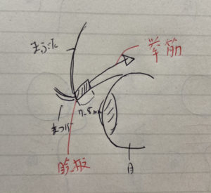 瞼板法で糸を通すのは大体マブタの端から7~8mmといったところが一般的です。