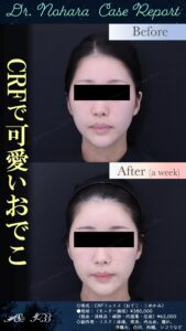 CRFフェイス(おでこ・こめかみ)は、凹んできたこめかみやおでこを補って、可愛い印象に蘇らせることができるので、常に人気の施術です。
