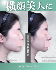 鼻尖形成のみでは高さを出すのが難しいことがありますが、軟骨移植を組み合わせることで、よりスッとした鼻先を実現できます。