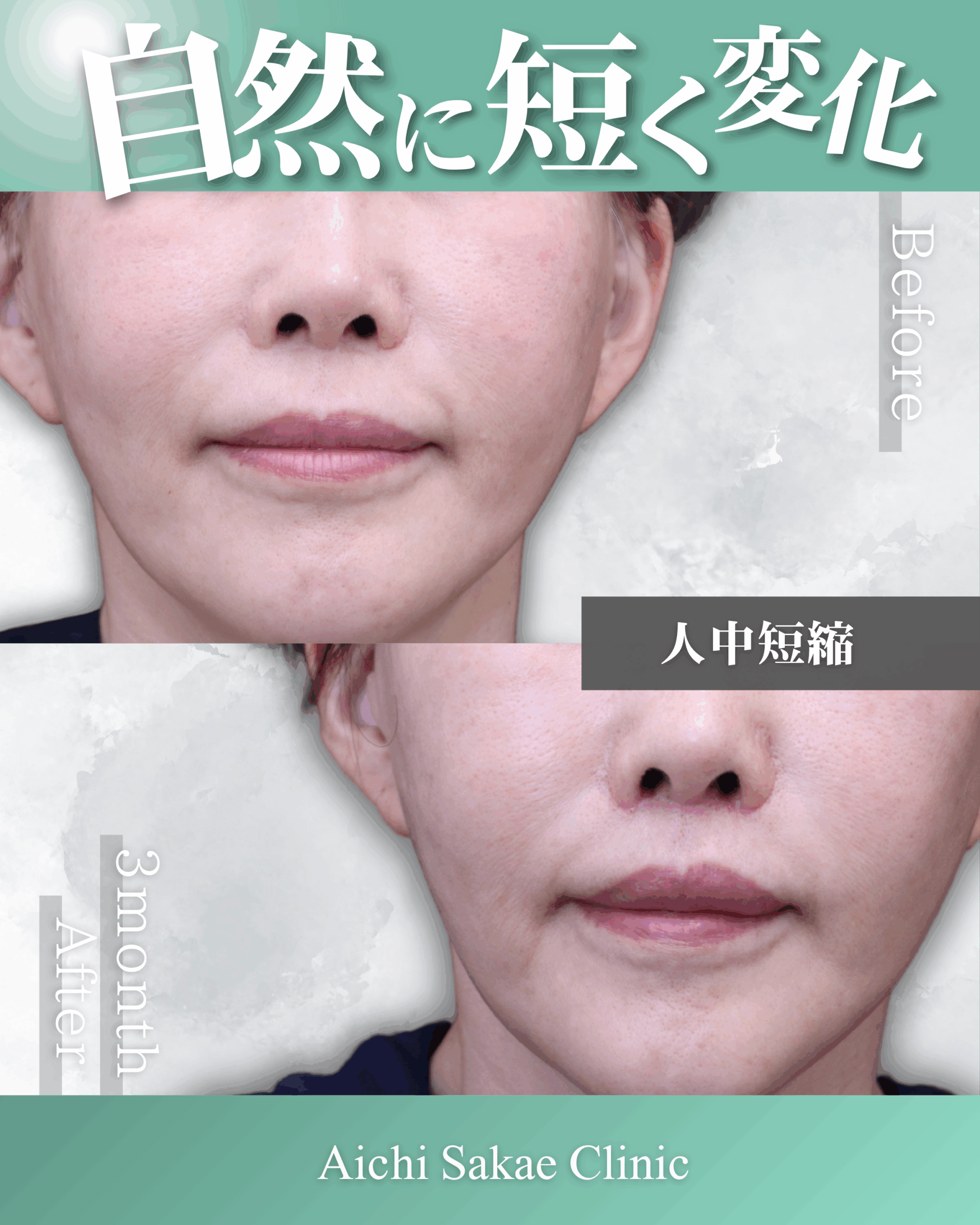 人中短縮術は、伸びた鼻の下の皮膚を数ミリ切除することで、鼻と唇の距離を縮める施術です。顔の下半分のバランスで顔の印象は変わり、鼻の下が長いと間延びした顔や老けこんだ印象になってしまいます。